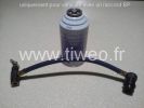 Remplir votre système comme indiqué ci-dessus et jusqu'a ce que la canette soit vide, déconnecter la valve du véhicule, et dévisser lentement la canette Attention une petite pression peut être présente entre la canette et le raccord (ne jamais dévisser une canette qui n'est pas vide), vérifier que le robinet et bien ouvert ainsi que la présence du joint noir avant de visser la nouvelle canette, rebrancher la valve sur le véhicule, et percuter la canette (tête en bas) pour envoyer cette nouvelle canette